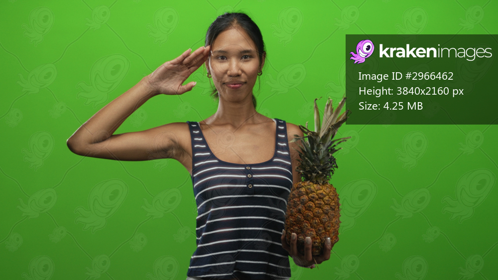 Woman holding pineapple salutes with raised arm and smile, wearing striped tank top against green screen studio backdrop; tropical playful fun.