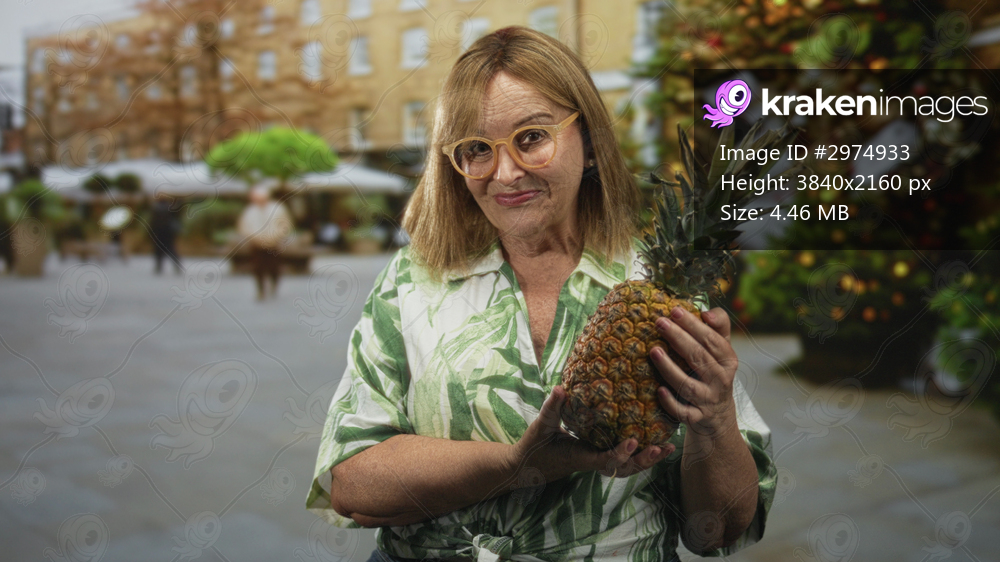 Woman holding pineapple and smiling, wearing glasses and a tropical shirt in a busy street plaza with cafes and a decorated christmas tree; cheerful holiday. - Kraken Images
