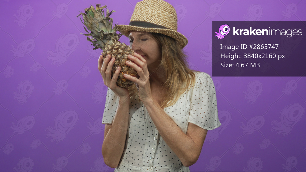 Woman holding pineapple to face in purple studio wearing straw hat and white polka dot dress; playful curiosity.