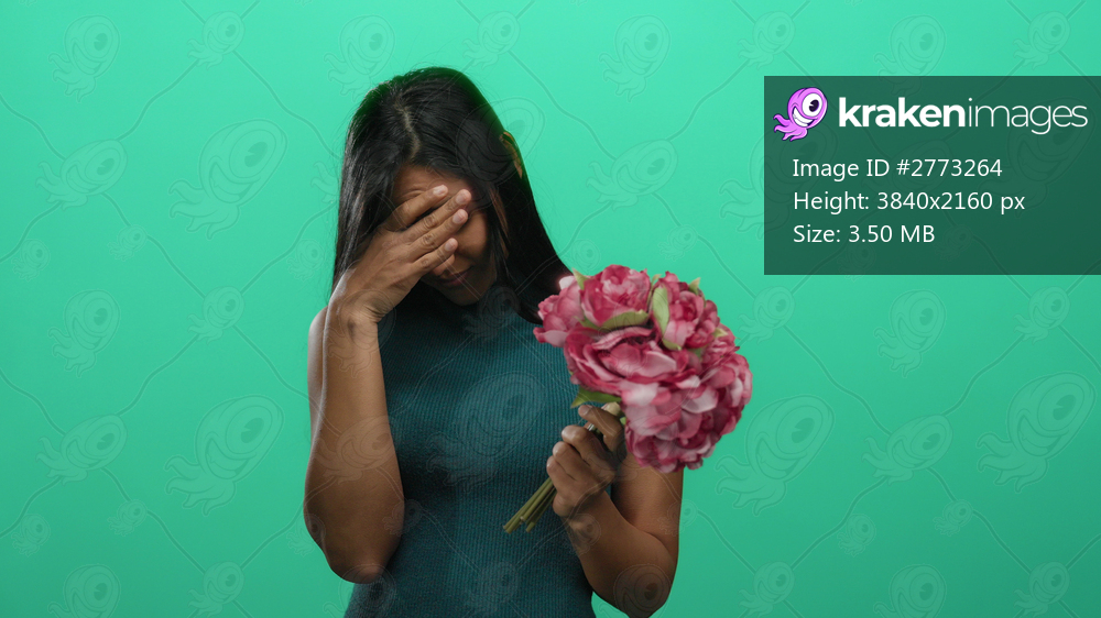 Woman holding pink bouquet against green wall looking shy and cheerful, embodying a playful and lighthearted mood.