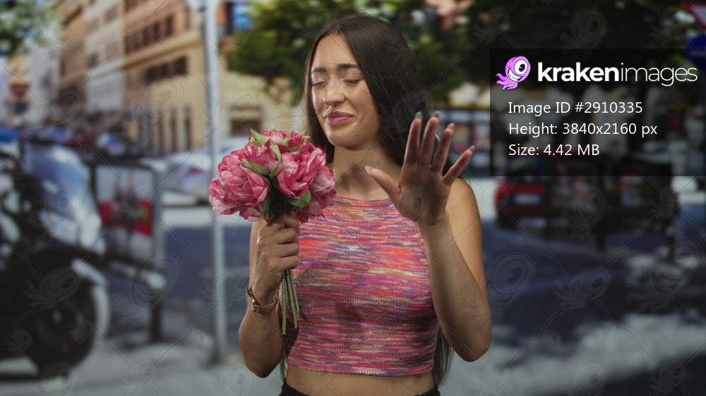 Woman holding pink bouquet close to chest with hand on busy city street, smiling; gratitude hope tenderness.