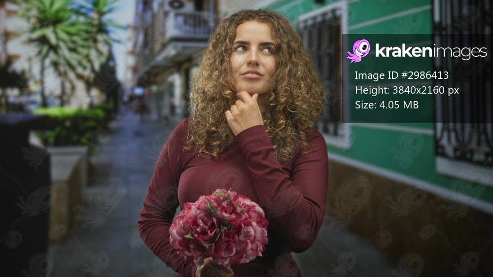 Woman holding pink bouquet with hand to chin thinking gesture on an urban street by a green building and planters; contemplation longing.