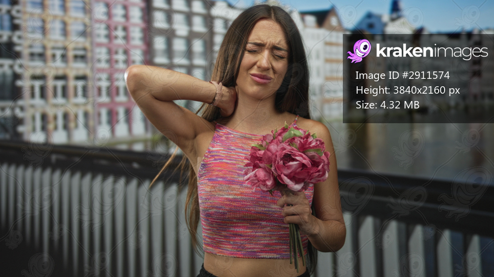 Woman holding pink bouquet, hand to neck, wearing sleeveless knit near a building by amsterdam canal; discomfort.