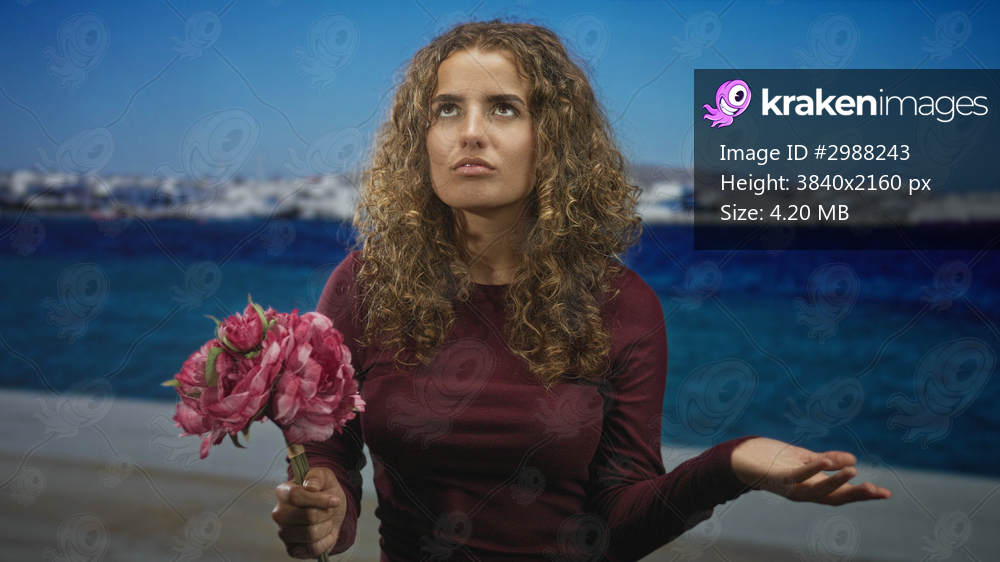 Woman holding pink bouquet with palm up gesture and slight shrug, curly hair, standing by seaside building and harbor waters; wistful longing.