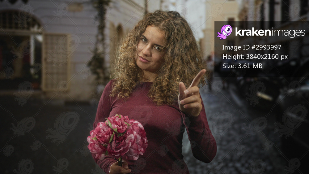 Woman holding pink bouquet and pointing index finger forward in cobblestone street with curly hair and maroon sweater; confident.