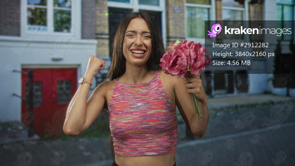Woman holding pink bouquet pumps fist on a street in front of a building, smiling with bare midriff and raised arm; joy celebration success.