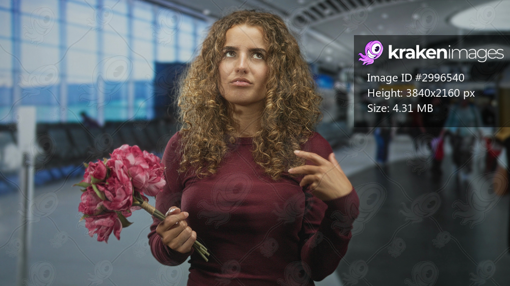 Woman holding pink bouquet shrugging in airport terminal with palm open in a dismissive offer; skepticism impatience waiting.