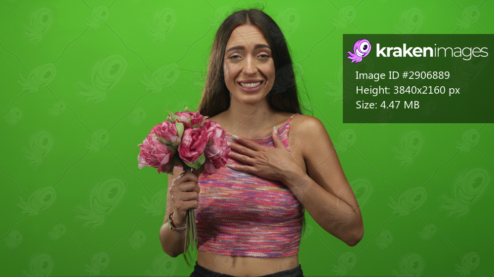 Woman holding pink bouquet and smiling with hand on chest and other hand holding stems in green studio; gratitude warm sincerity.