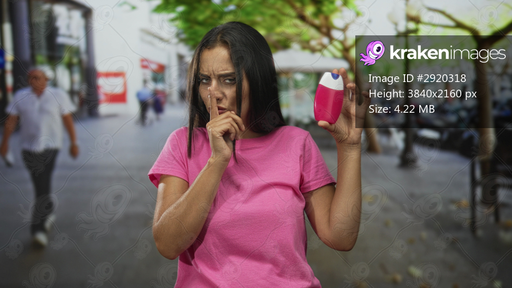 Woman holding pink deodorant bottle with finger to lips while facing camera on city street amid blurred pedestrians and trees; silence.
