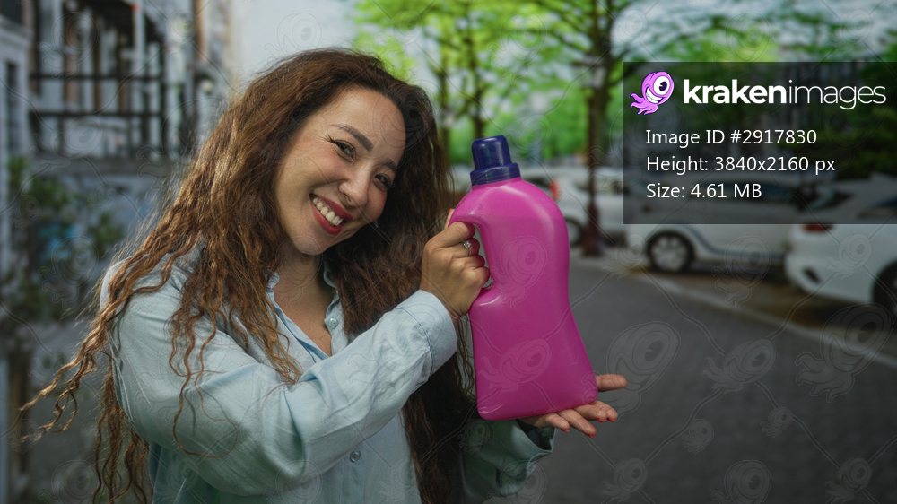 Woman holding pink detergent bottle with hand presenting it on a city street parking lane, smiling at camera; home cleaning joy.