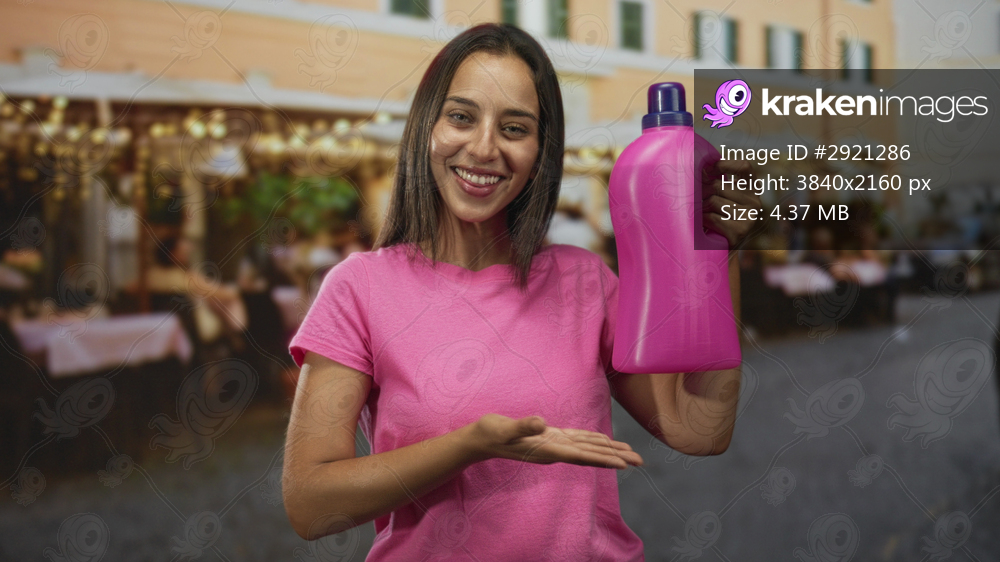 Woman holding pink detergent bottle and presenting it with both hands at a restaurant terrace outdoors, smiling and gesturing toward the bottle; product promotion confidence. - Kraken Images