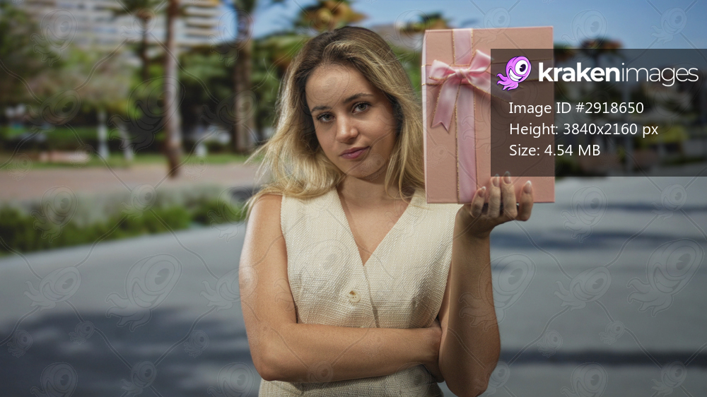 Woman holding pink gift box with arms crossed on street promenade in daylight, showing unimpressed face and slight shoulder exposure; indifference refusal. - Kraken Images