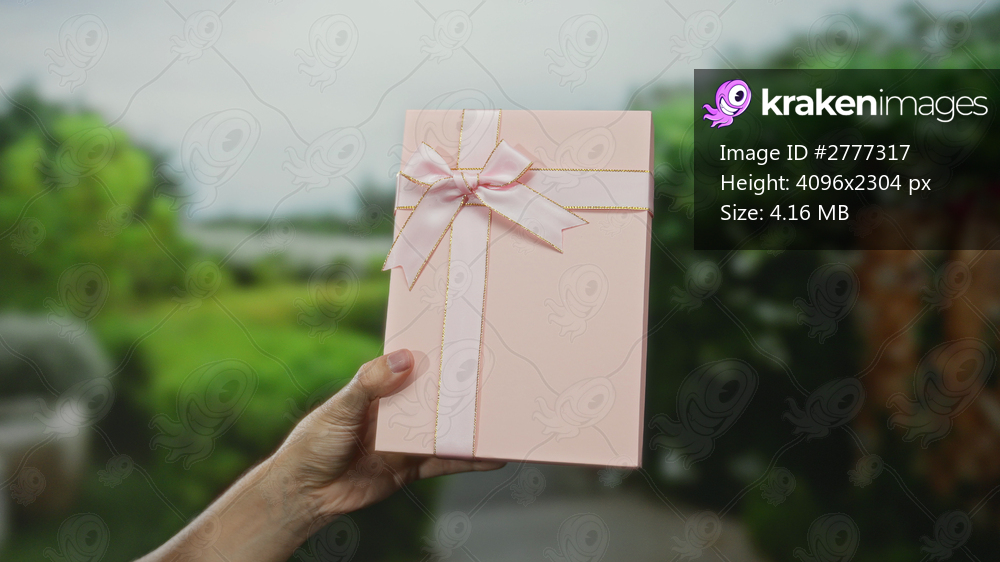 Woman holding pink gift box with bow in outdoor garden setting, showcasing a present in the lush green background.