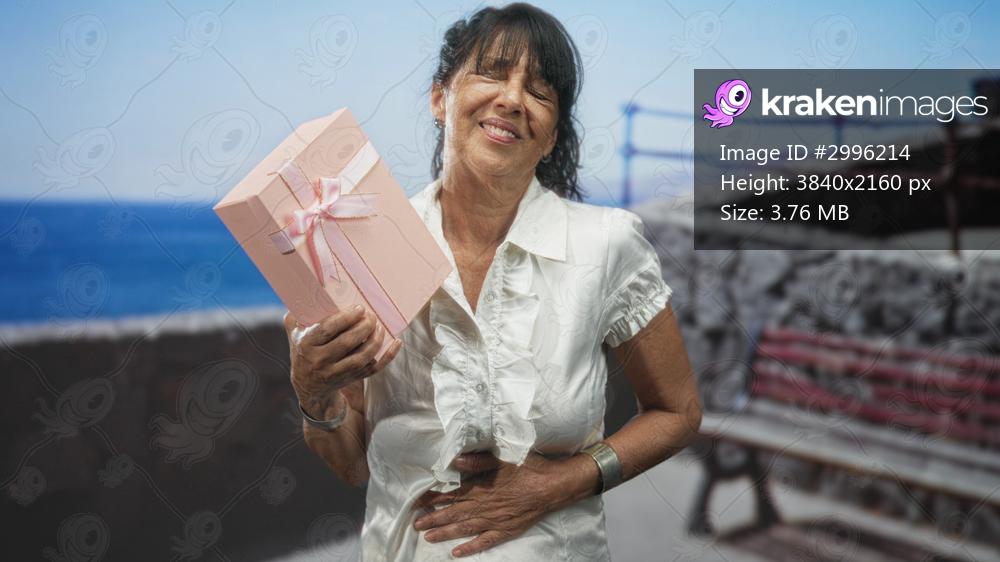 Woman holding pink gift box with hand on stomach on street by seaside bench, eyes closed smiling; gratitude celebration.