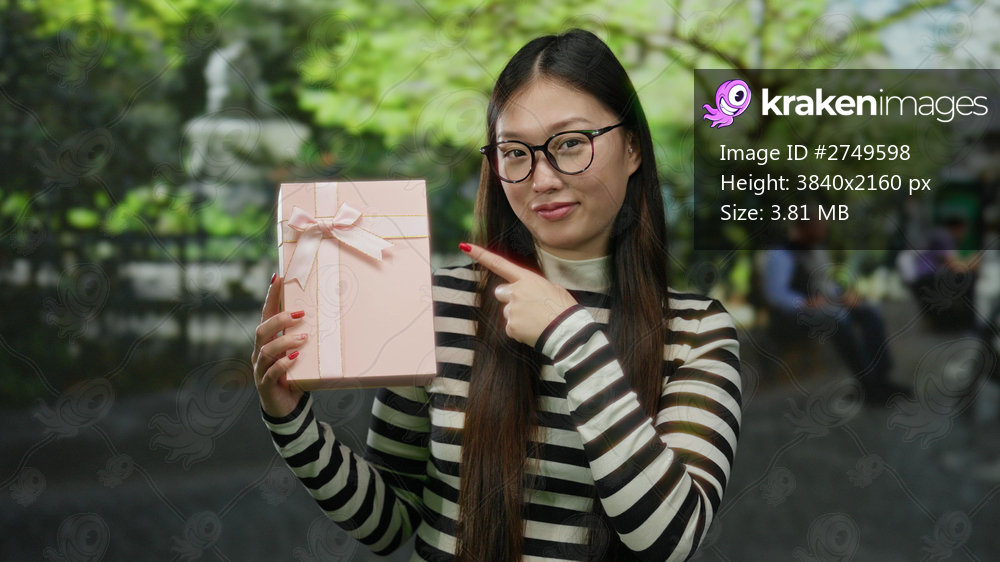 Woman holding pink gift box in outdoor park setting with long hair and glasses creating a cheerful impression amid lush greenery and fountain backdrop in a public space - Kraken Images