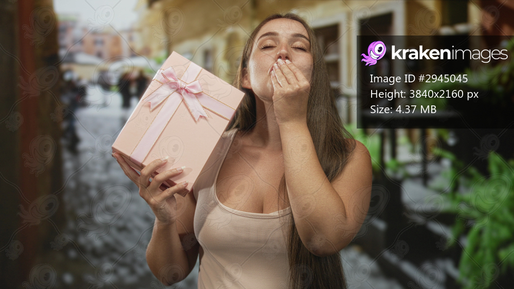 Woman holding pink gift box near outdoor cafe tables on cobblestone street smiling and blowing a kiss; joy gratitude.