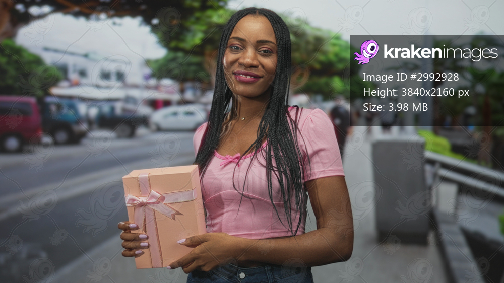 Woman holding pink gift box on street smiling with braided hair and visible hands;present celebration joy.