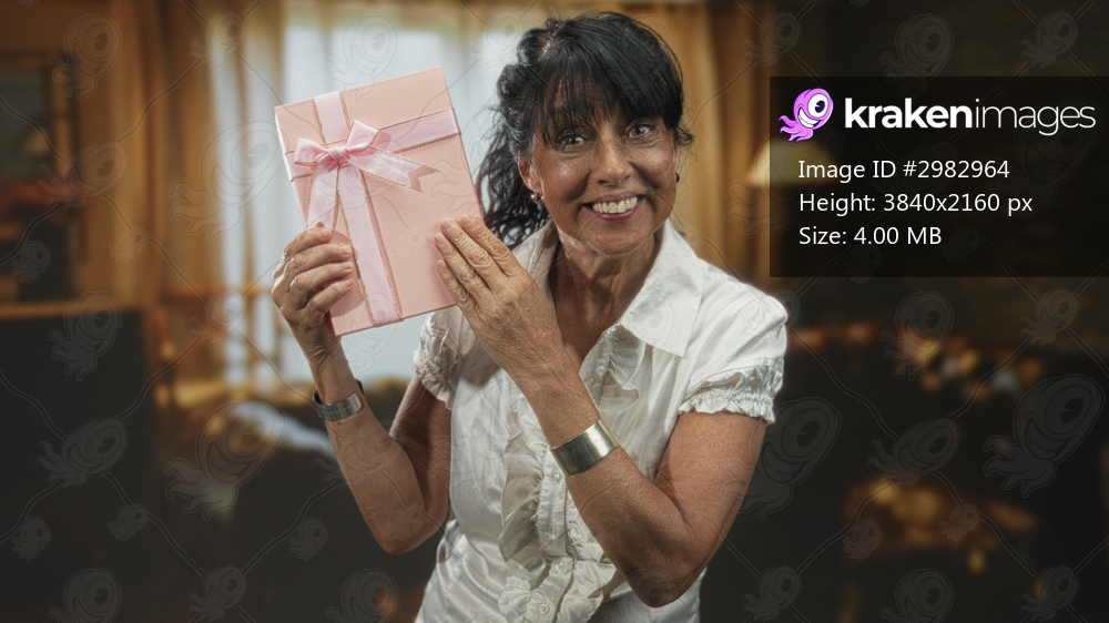 Woman holding pink gift box with ribbon and cupping hand to mouth while smiling in a building; joy surprise celebration.