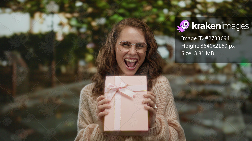 Woman holding pink gift box with ribbon outdoor in city street, smiling happily wearing glasses and sweater, surrounded by blurred urban background.