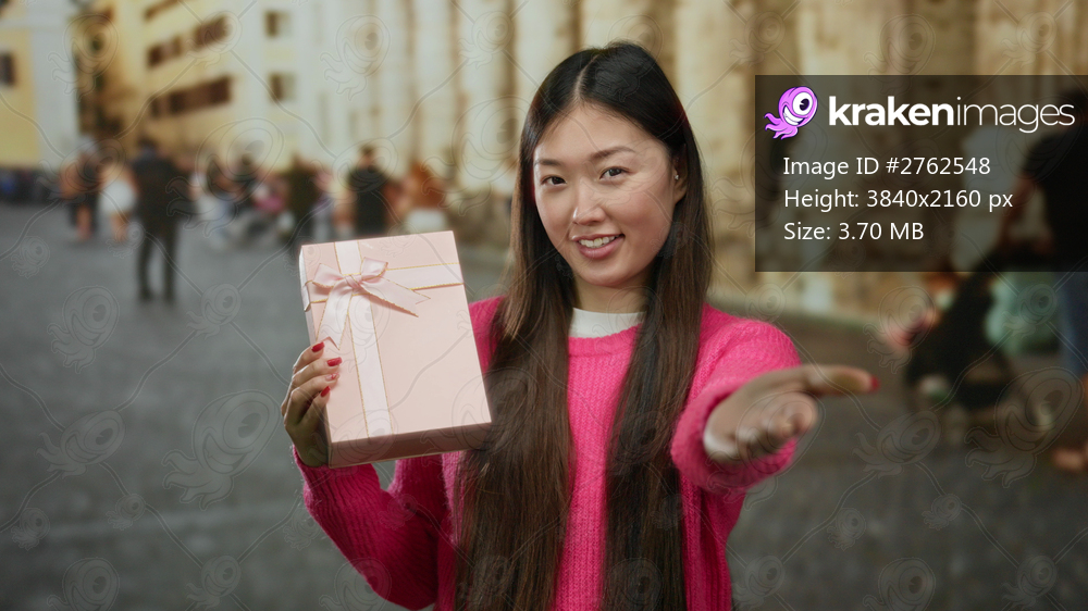 Woman holding pink gift box smiles on urban street in city background showcasing cheerful outdoor scene with vibrant expressions and inviting gesture.