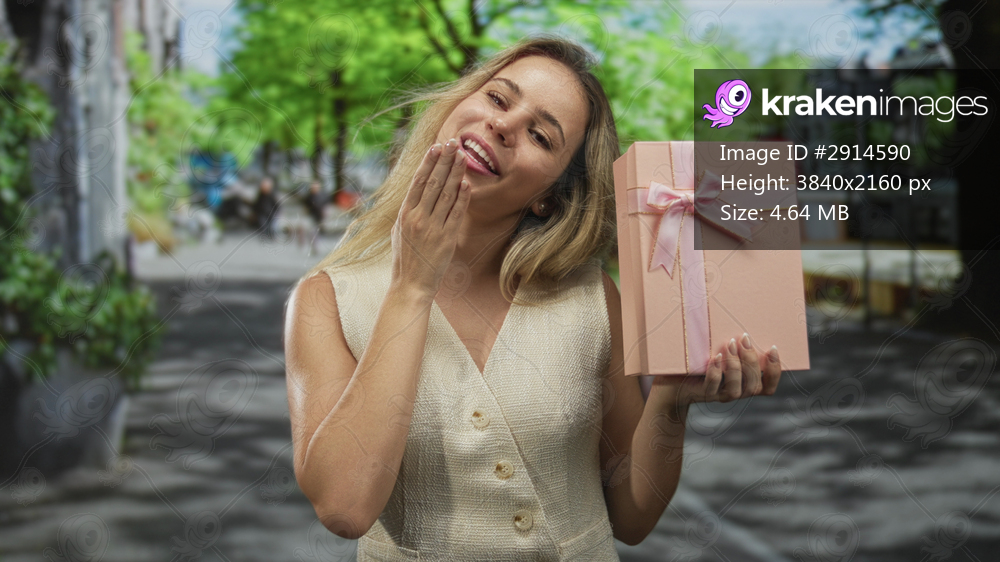 Woman holding pink gift box smiling and blowing a kiss on city street with trees and cafes; joy celebration.