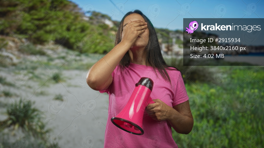 Woman holding pink megaphone and covering mouth in pink t shirt on sandy beach with green dunes; exhaustion silence.