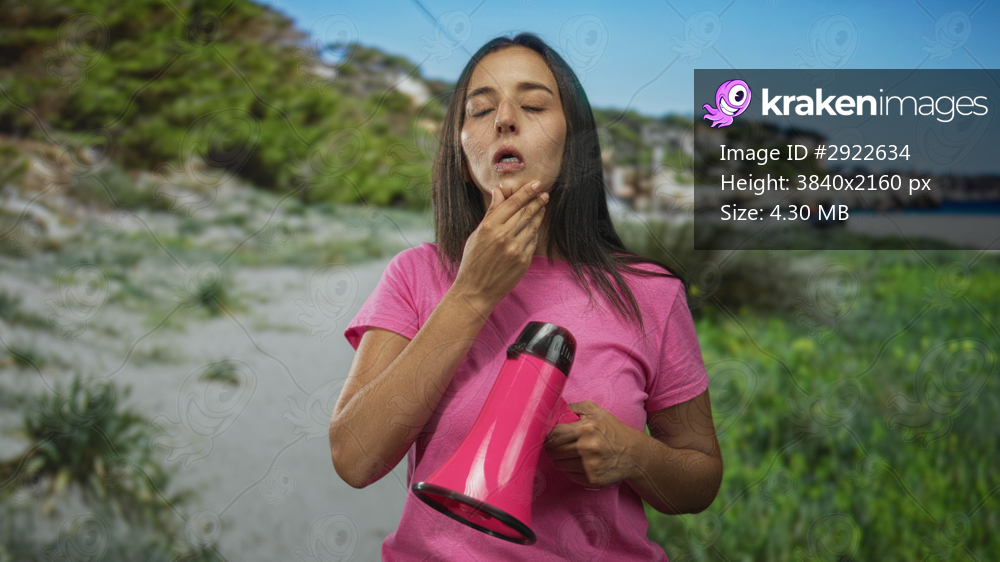 Woman holding pink megaphone and covering mouth in pink t shirt on sandy beach with green dunes; exhaustion silence.