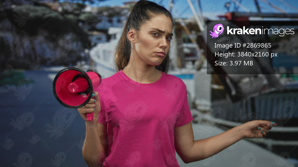 Woman holding pink megaphone in hand, frowning and shrugging on a street dock by boats; annoyance dismissal.
