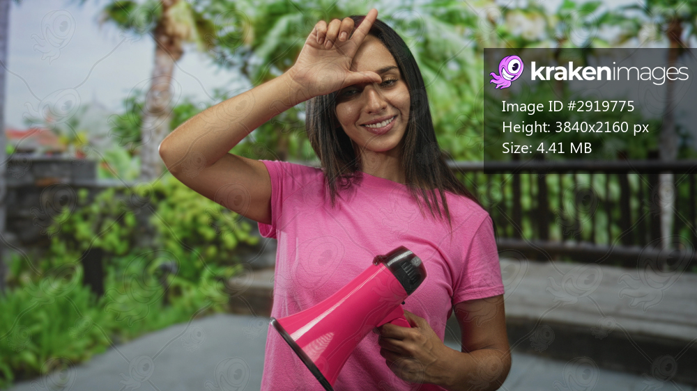 Woman holding pink megaphone points finger at camera on street with palm trees; playful provocation.