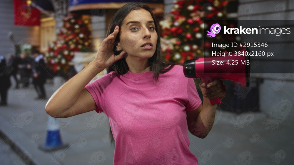 Woman holding pink megaphone speaking with hand to ear on a city street with christmas tree and traffic cone; urgency advocacy.