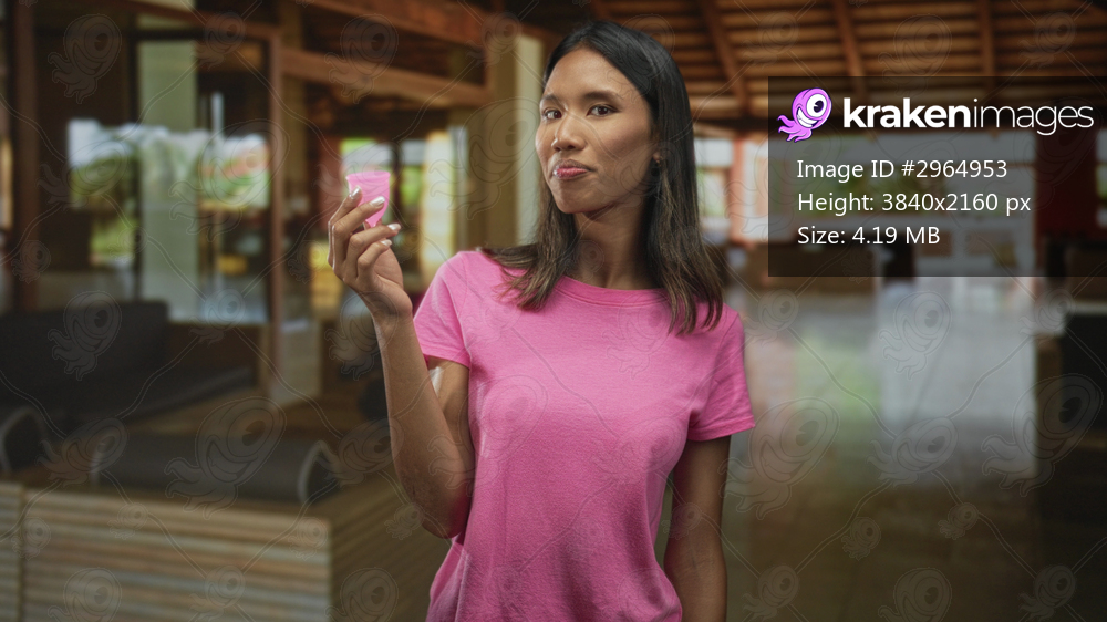 Woman holding pink menstrual cup in hand inside a building, smiling while inspecting the product; confidence wellness.