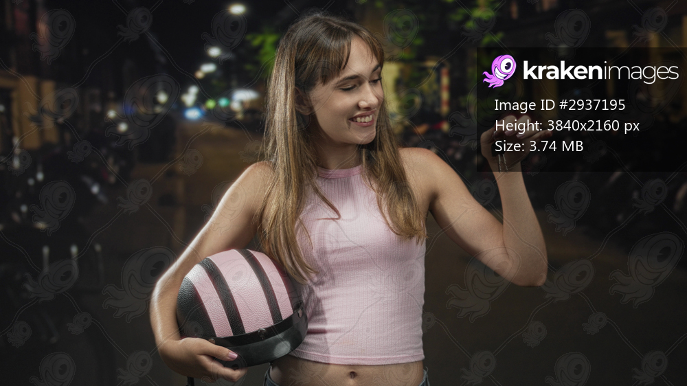 Woman holding pink motorcycle helmet and bike keys on a city street at night showing bare midriff and smiling; confidence independence mobility.