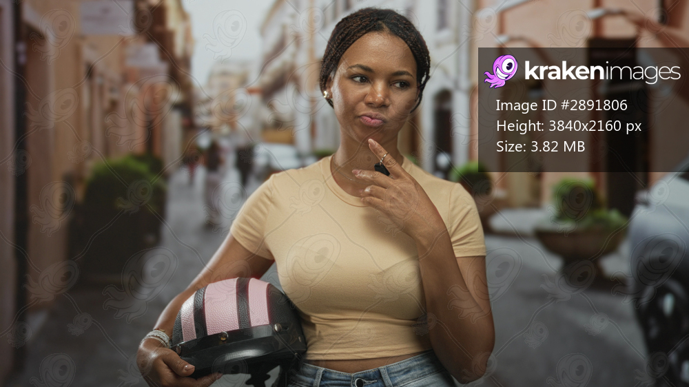 Woman holding pink motorcycle helmet and finger on chin, wearing casual crop top and jeans on city street; thoughtful contemplation.