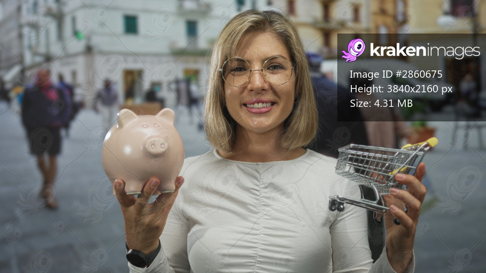 Woman holding pink piggy bank and small silver shopping cart on a busy street scene; saving versus spending dilemma.