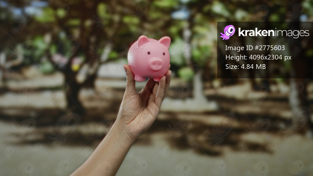 Woman holding pink piggybank outdoors in a sunny park setting.