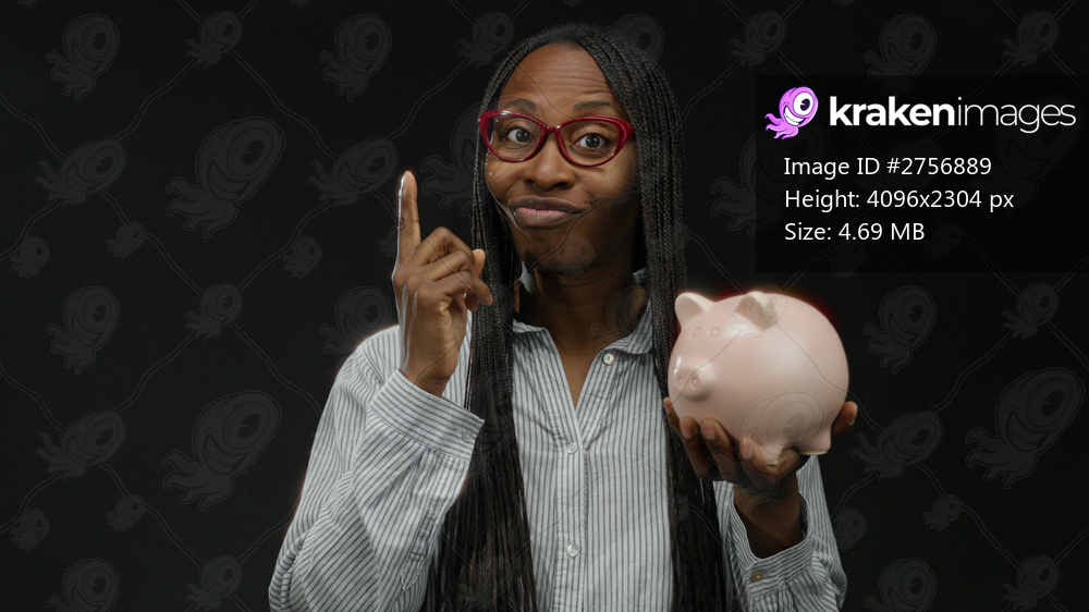 Woman holding pink piggybank wearing glasses against black background, suggesting savings and financial concepts, isolated in studio setting emphasizing calm confidence. - Kraken Images