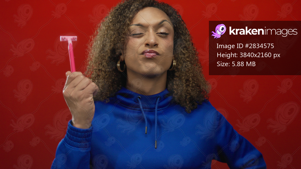 Woman holding pink razor close to face with hand on cheek in red studio with furrowed brow; uncertainty.