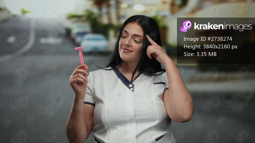 Woman holding pink razor on city street with confident expression suggesting beauty and lifestyle choices on a sunny day.