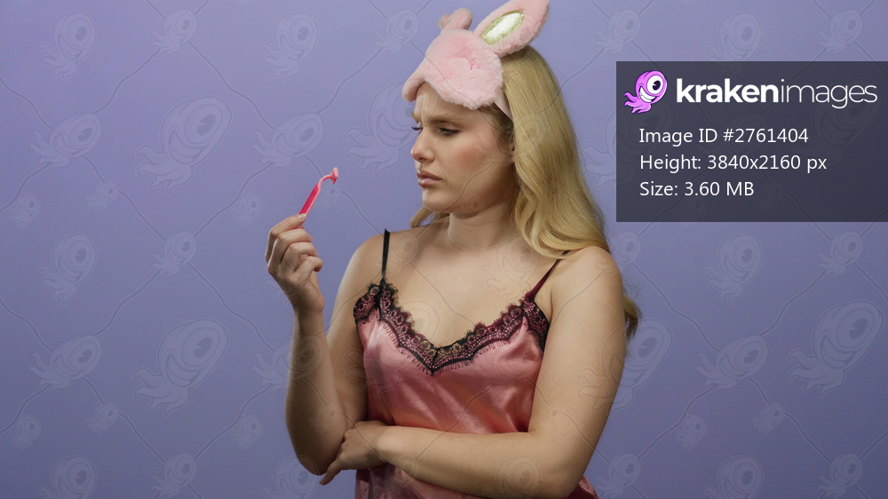 Woman holding pink razor wearing nightwear against purple background contemplating grooming choices with thoughtful expression.
