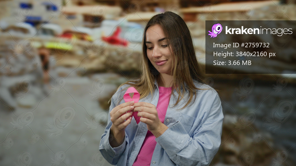 Woman holding pink ribbon at seaside beach, symbolizing breast cancer awareness in casual attire, smiling warmly with ocean backdrop enhancing serene atmosphere. - Kraken Images