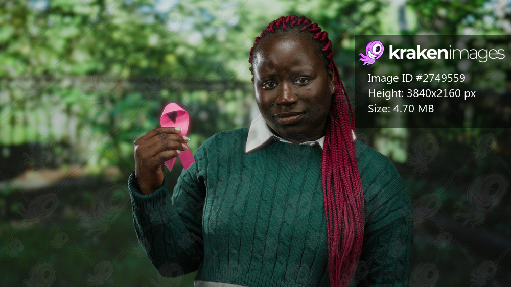 Woman holding pink ribbon in outdoor park, symbolizing breast cancer awareness with an afro-american heritage focus, set against natural greenery, capturing a moment of support. - Kraken Images