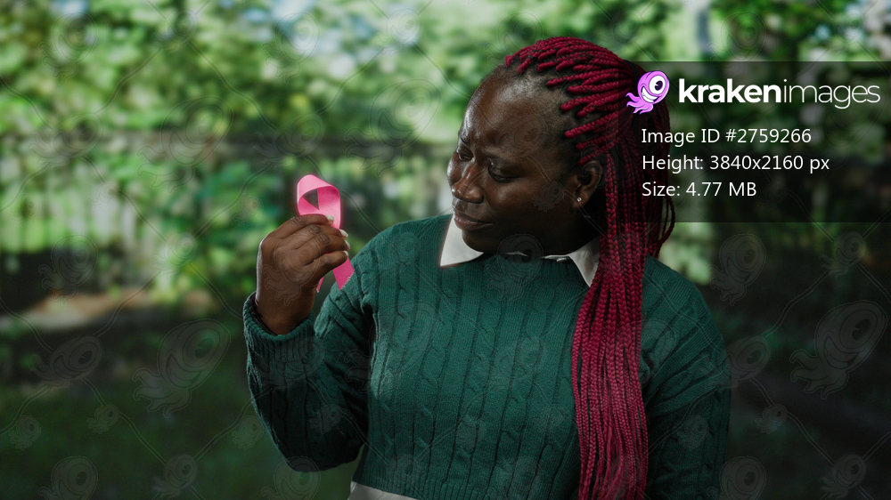 Woman holding pink ribbon in outdoor park, symbolizing breast cancer awareness with an afro-american heritage focus, set against natural greenery, capturing a moment of support. - Kraken Images