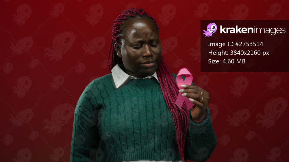 Woman holding pink ribbon standing against vibrant red background symbolizing breast cancer awareness.
