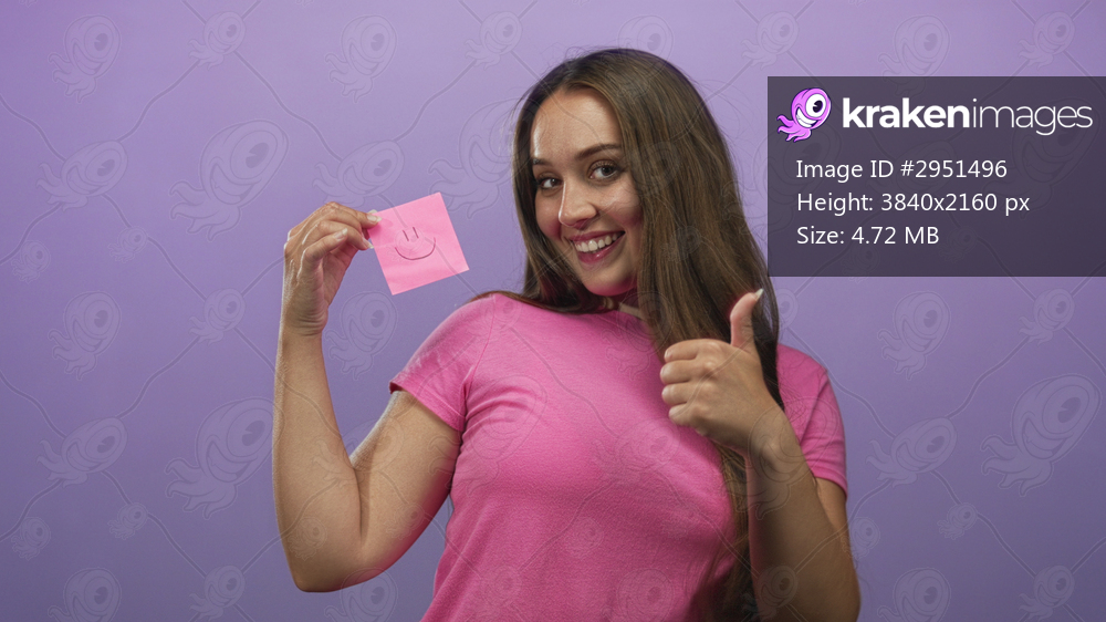 Woman holding pink sticky note with drawn smile and giving thumbs up in studio with purple backdrop; joy positivity confidence.