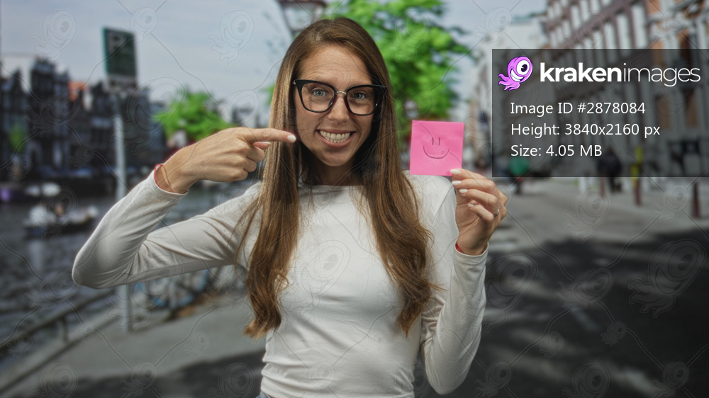 Woman holding pink sticky note with smile and clenched fist on street in amsterdam; joy celebration success.