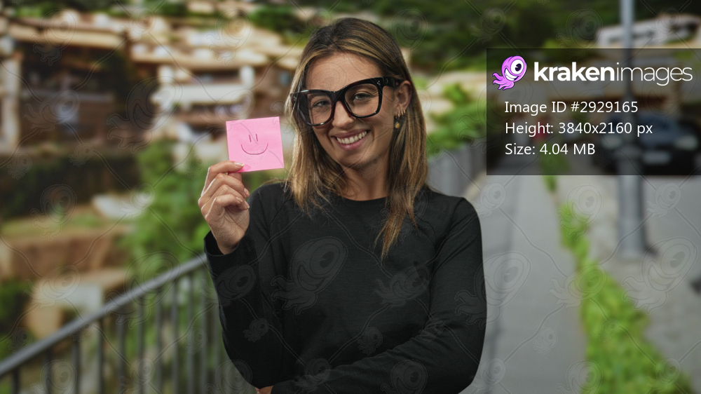 Woman holding pink sticky note with smile drawn, hand raised on street beside railing and parked cars; optimism positive message.
