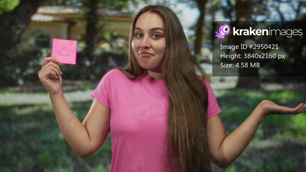 Woman holding pink sticky note with smiley in park, hand raised to display the note; optimism encouragement smile.
