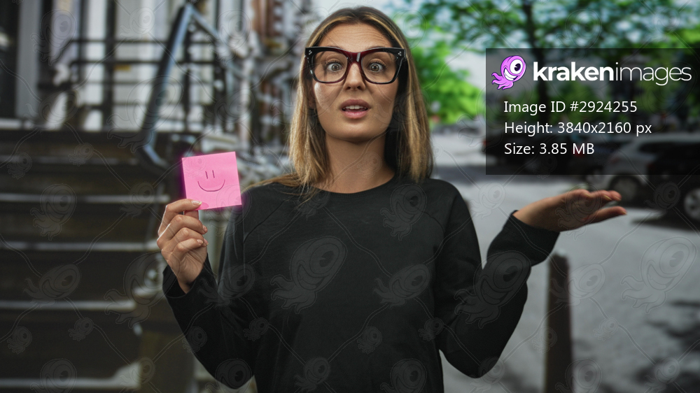 Woman holding pink sticky note with smiley and palm up gesture on street near parked cars and metal staircase; uncertainty.