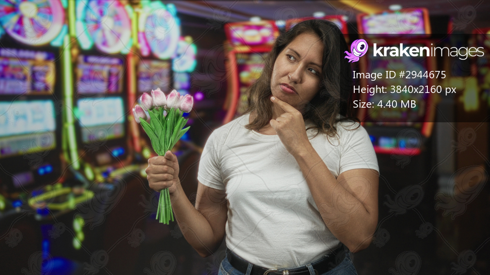Woman holding pink tulip bouquet while pointing index finger up beside slot machines in casino; playful curiosity.