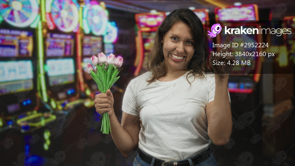 Woman holding pink tulip bouquet while pointing index finger up beside slot machines in casino; playful curiosity.